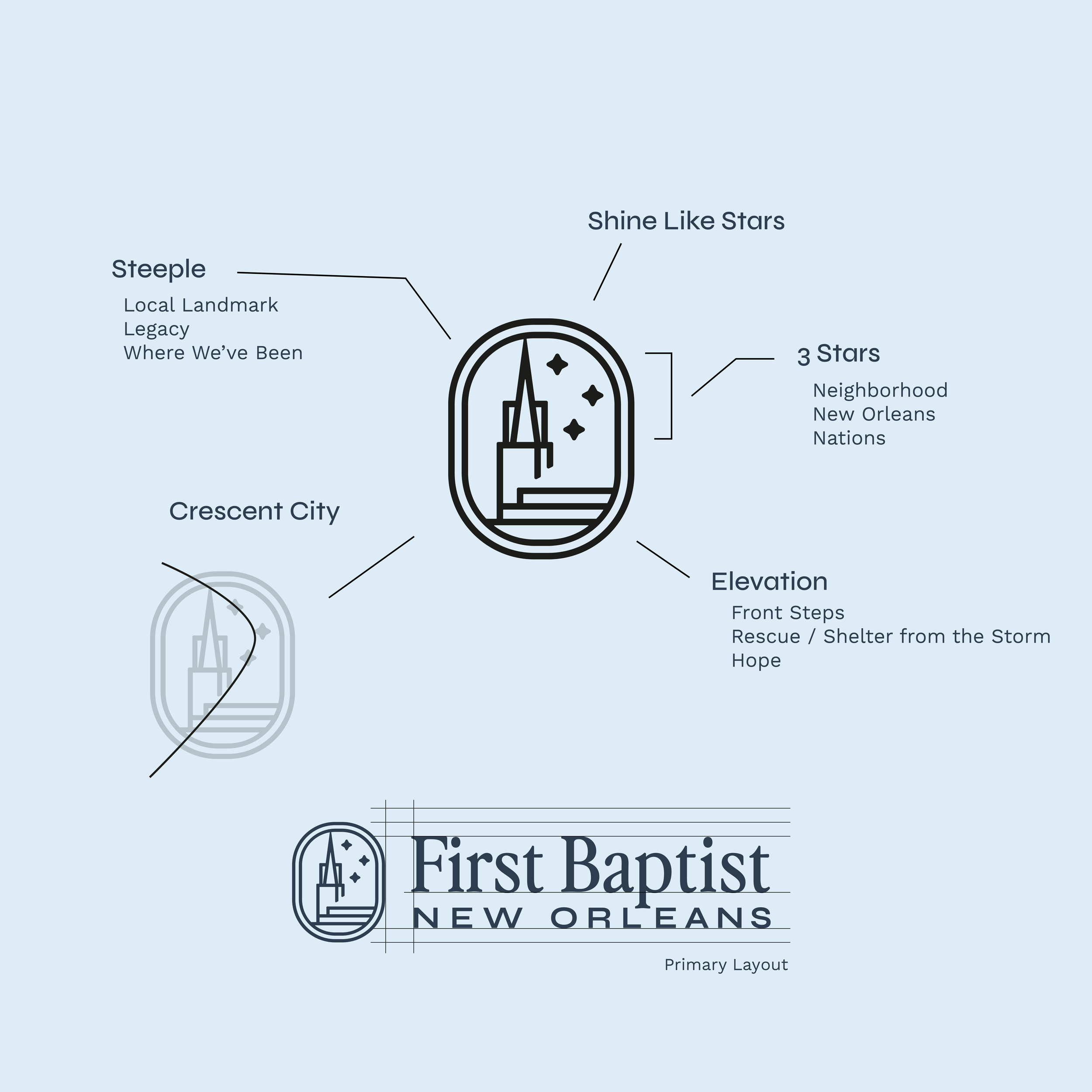 Elevating the church steeple in the logo design brought clarity to their traditional identity. The curve around the three stars was a nod to the “crescent city” curve of the Mississippi River in town. Choosing three stars was intentional. It was meant to mirror the threefold outreach strategy of the church of reaching the neighborhood, New Orleans and the nations.