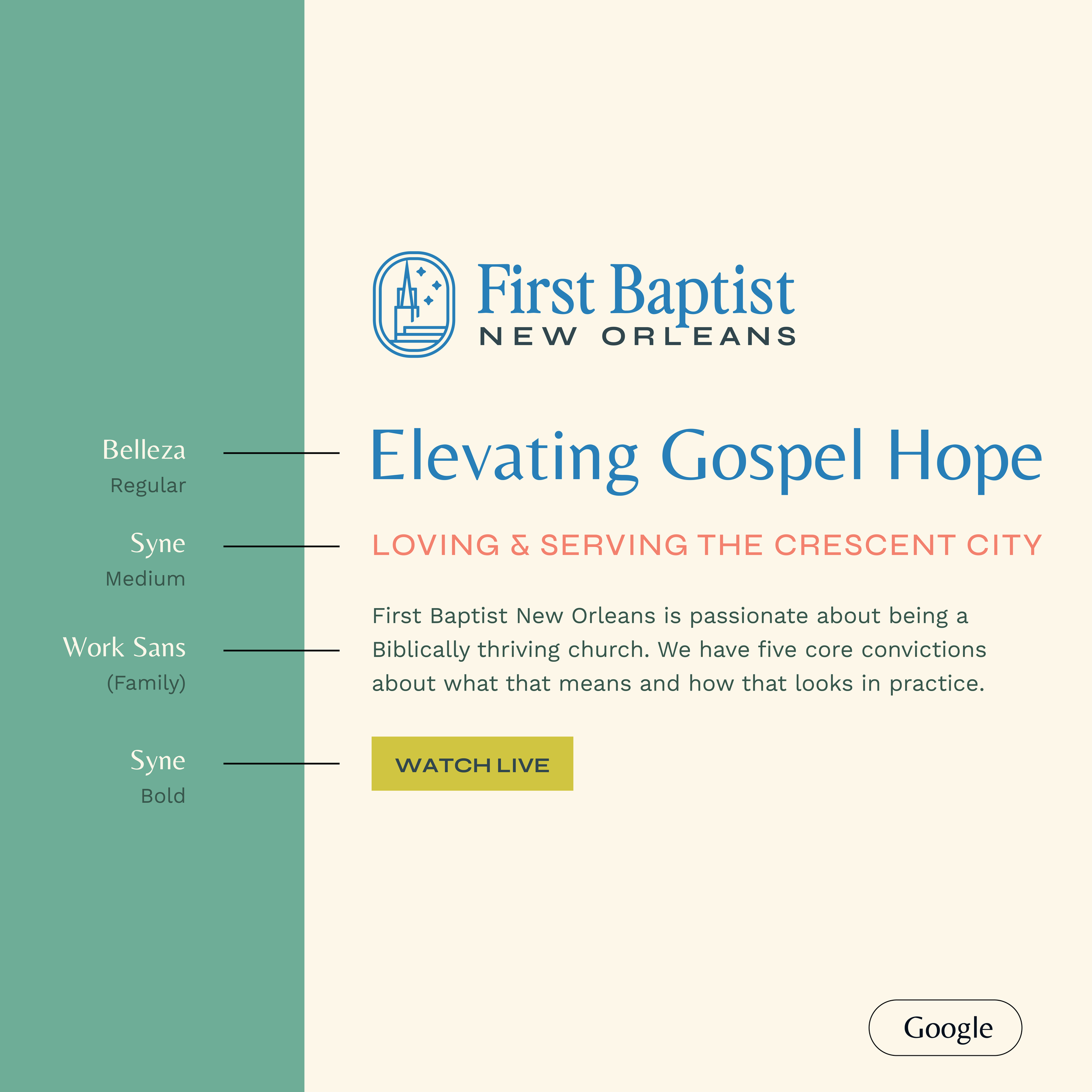 First Baptist New Orleans set out to rebrand their church to better reach the growing number of young professionals in the area. Their old logo design worked, but it didn’t carry the impact they were wanting to make moving forward. The bones they decided to keep were in the iconic steeple that’s visible from a busy interstate nearby. Sometimes the physical landmark as your brand anchor is something strong to consider.